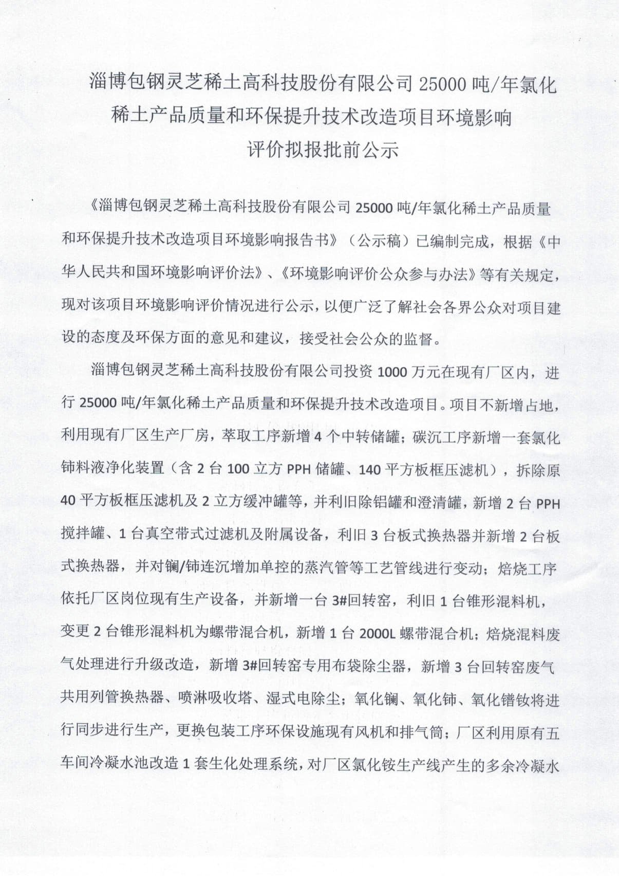 淄博包鋼靈芝稀土高科技股份有限公司25000噸/年氯化稀土產品質量和環保提升技術改造項目環境影響評價擬報批前公示